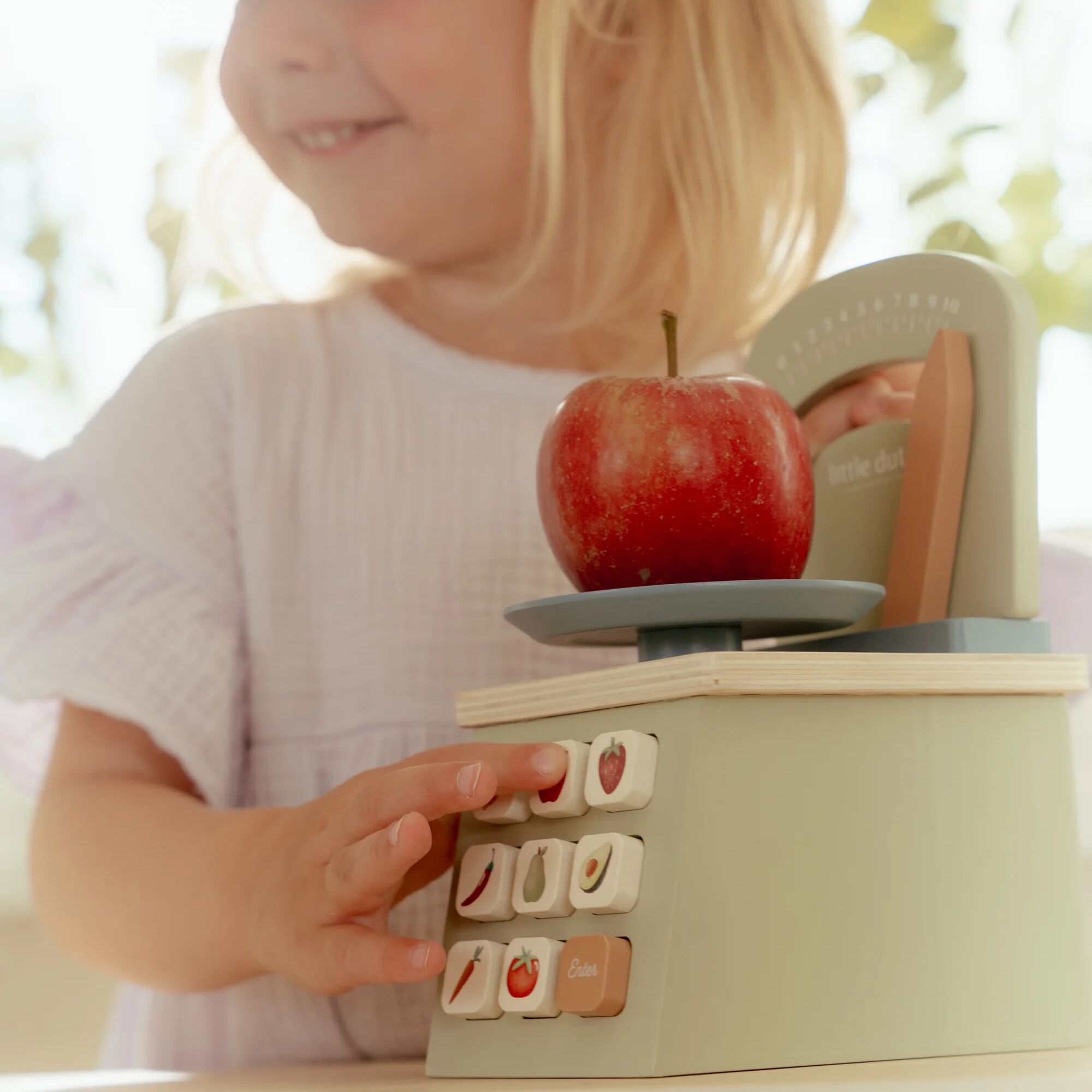 Diese hölzerne Spielwaage von LITTLE DUTCH ermöglicht kleinen Köchen und Bäckern ein präzises Abwiegen ihrer Zutaten. Mit echten, drehbaren Knöpfen und anschaulichen Illustrationen fördert sie realistisches Rollenspiel in der Küche. Die robuste FSC-zertifizierte Holzverarbeitung garantiert Langlebigkeit und Nachhaltigkeit. Ideal als Ergänzung zur Spielküche und zum Backset für vielseitigen, kreativen Spielspass.