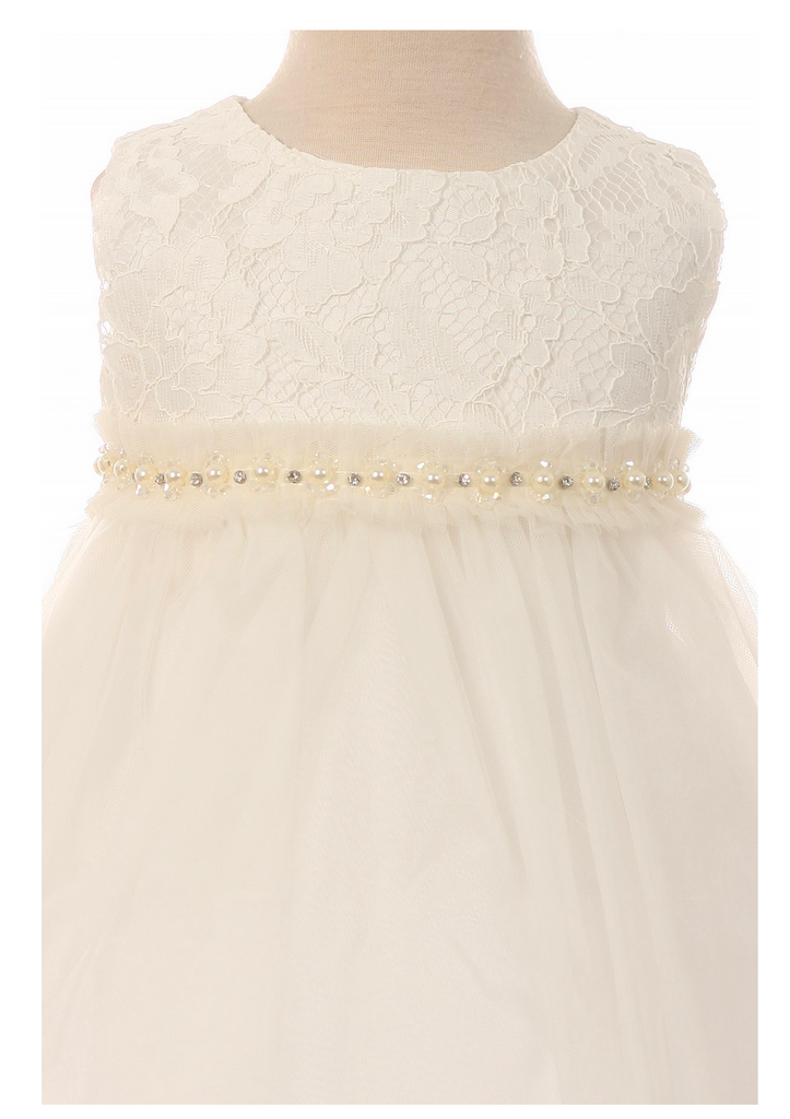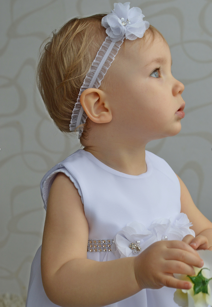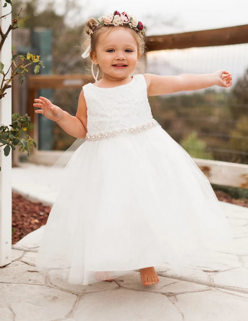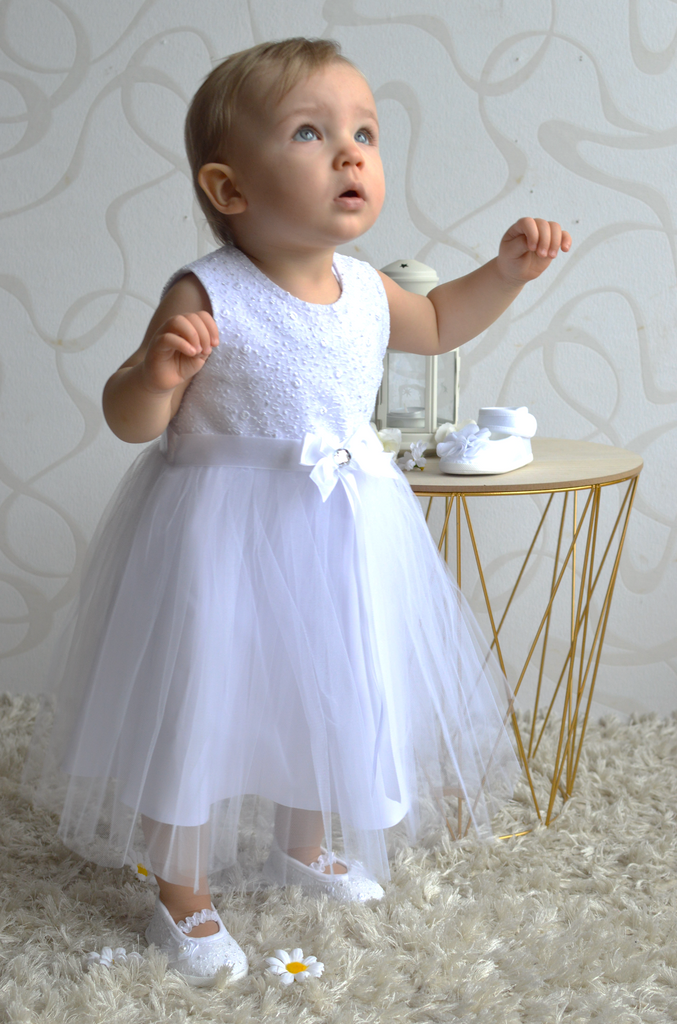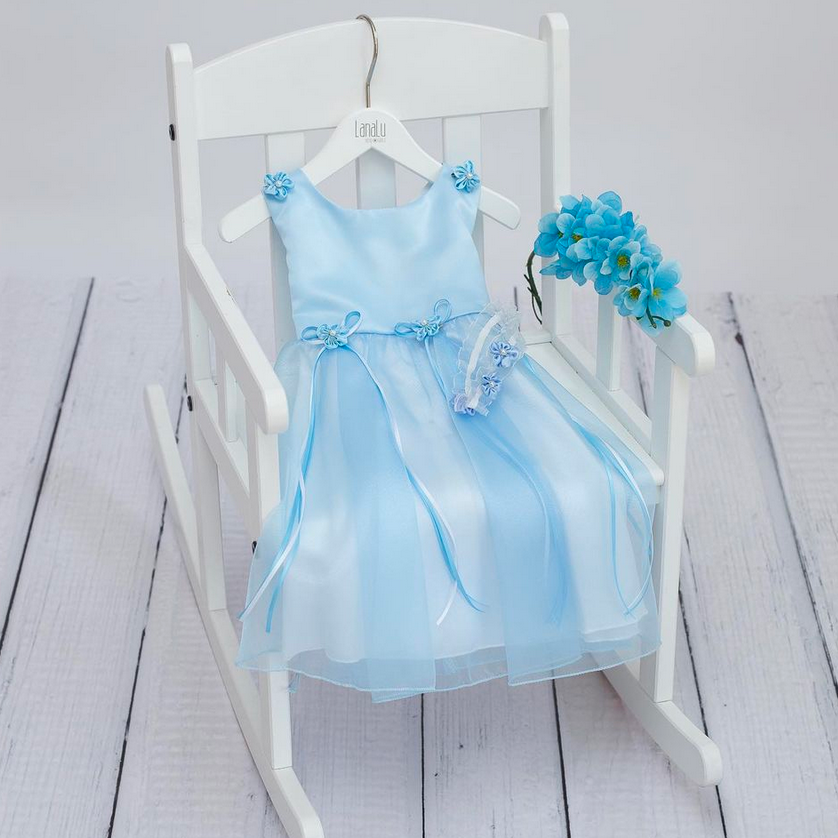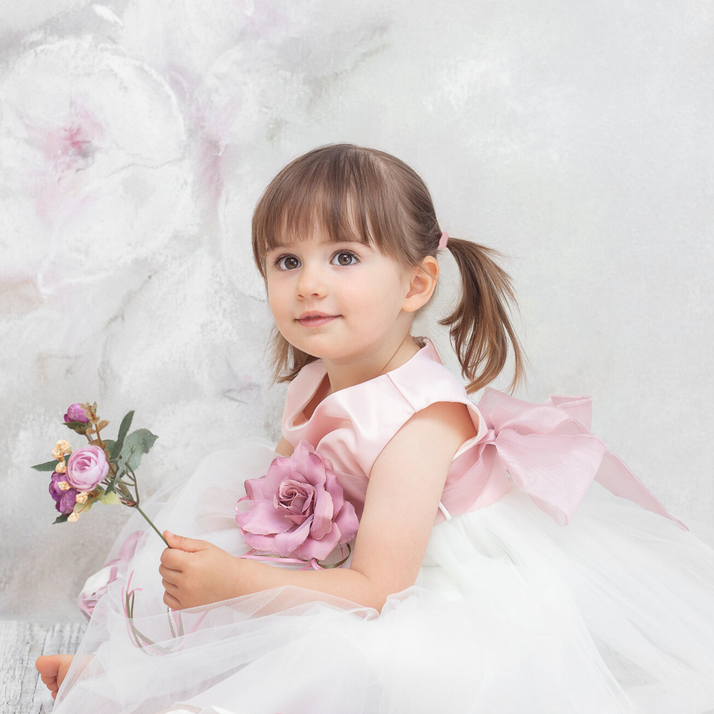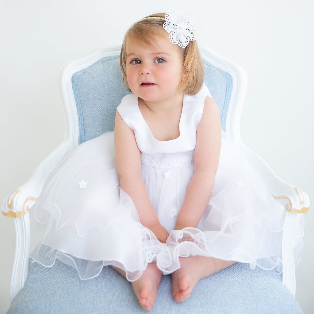 Das Festkleid Enya besticht durch die wunderschönen Blumen und Maschenstickerein. Die farblich passende Blumenapplikation kann nach Wunsch getragen oder abgenommen werden. Der mehrlagige Rock wirkt durch die Transparenz und den besonderen Schnitt der oberen Rocklagen sehr voluminös. Auf dem Rücken können Sie den Taillenumfang mit einem feinen Tüllband regulieren.