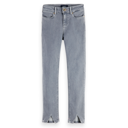 High Rise Skinny Fit in grauem Super-Stretch-Gewebe mit 20% recycelter Baumwolle. Eine mittlere blaue Waschung mit einem Spitzen Detail am vorderen unteren Saum.