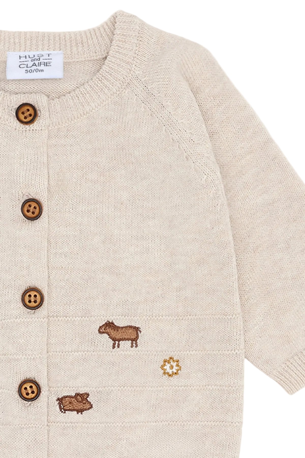 Diese hochwertige Strickjacke von Hust & Claire besticht durch ihre zeitlose Eleganz und praktische Funktionalität. Gefertigt aus reiner Baumwolle, bietet sie optimalen Tragekomfort und Atmungsaktivität für empfindliche Babyhaut. Die liebevollen Bauernhof-Applikationen verleihen dem Stück einen charmanten, verspielten Charakter. Das unisex Design macht die Jacke zur vielseitigen Wahl für Jungen und Mädchen. Perfekt für Übergangsjahreszeiten – eine zuverlässige Grundlage für die Babygarderobe.