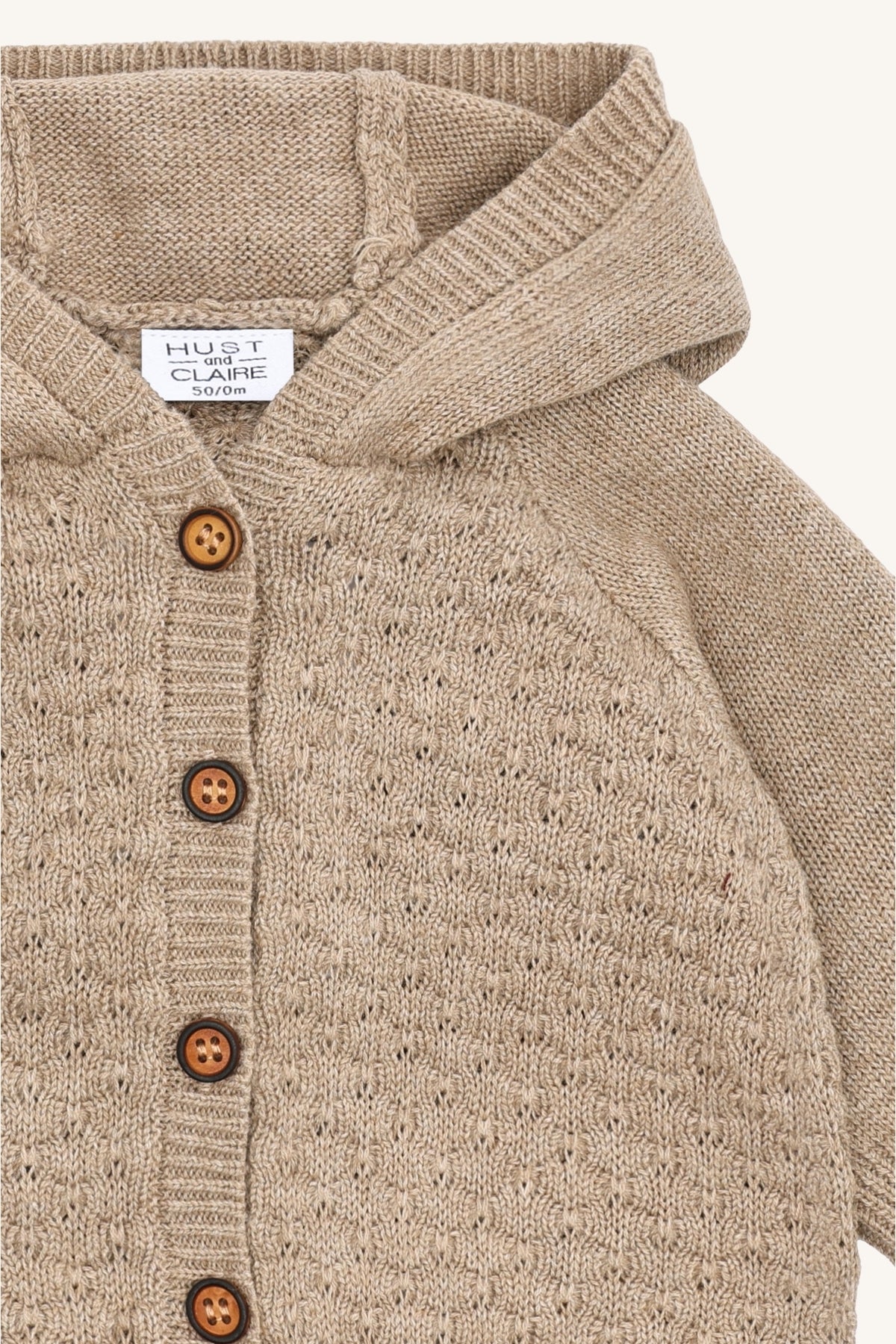 Diese süsse Baby-Strickjacke von HUST & CLAIRE überzeugt durch ihre nachhaltige Herstellung aus reiner Bio-Baumwolle, die besonders sanft zur empfindlichen Babyhaut ist. Die Kapuze mit niedlichen Öhrchen und dem liebevoll gestalteten Hirschgesicht verleiht der Jacke einen verspielten Charme. Perfekt für warme, weiche Geborgenheit bei allen kleinen Abenteuern.