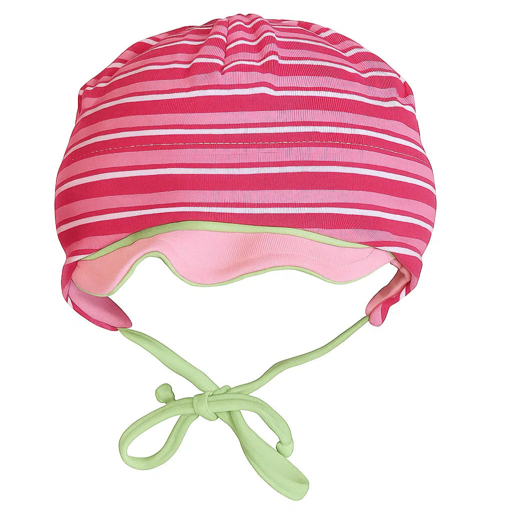 Kinder-Sonnenmütze mit UPF 50+ – Ringel pink/rosa, grüne Bindebänder