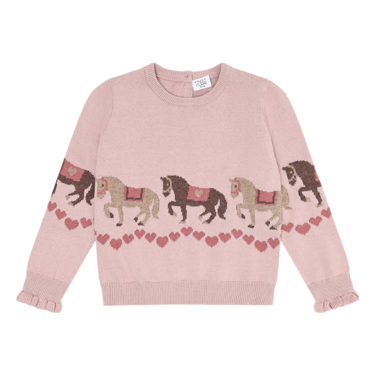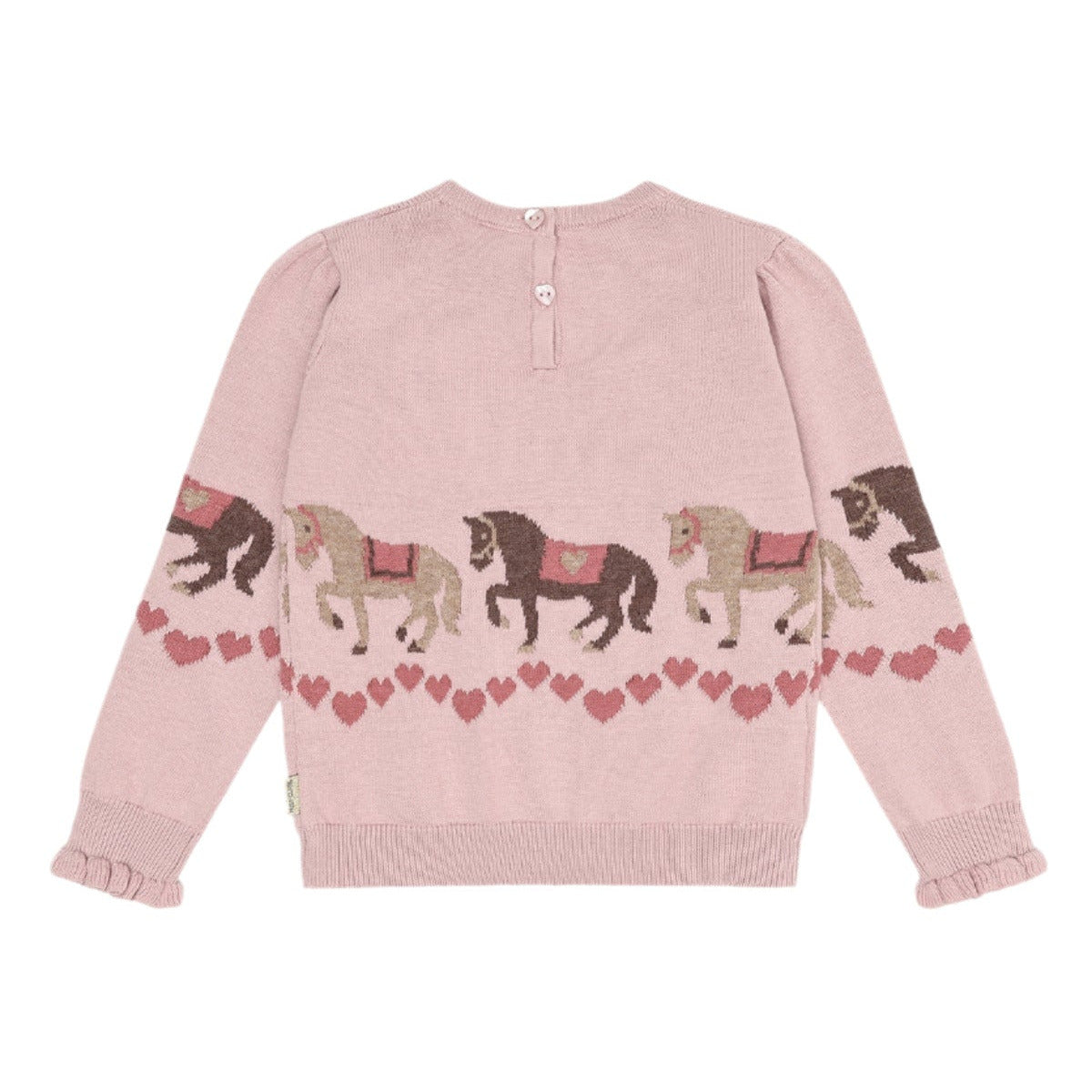 Dieser klassische Strickpullover für Mädchen von HUST & CLAIRE besticht durch ein charmantes Pferdemuster und praktische Knöpfe auf der Rückseite, die das An- und Ausziehen erleichtern. Hochwertige Verarbeitung sorgt für angenehmen Tragekomfort und Langlebigkeit. Ideal für stilbewusste Kinder, die Wert auf Qualität und Funktionalität legen.