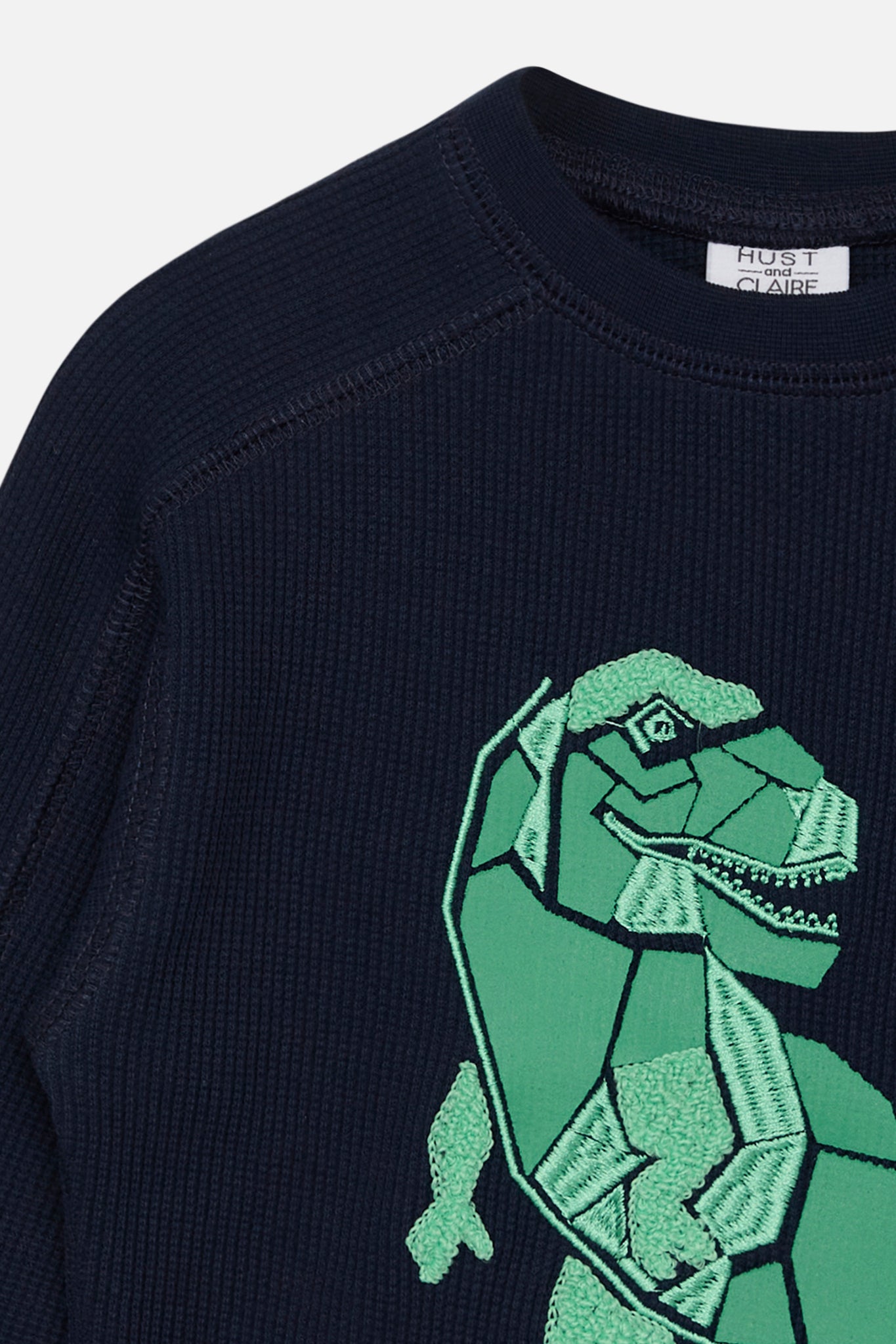 Dieses Langarmshirt aus gewebter Baumwolle zeigt ein Dinosauriermotiv auf der Vorderseite. Mit 95% Bio-Baumwolle steht dieses Produkt für Nachhaltigkeit und Komfort.