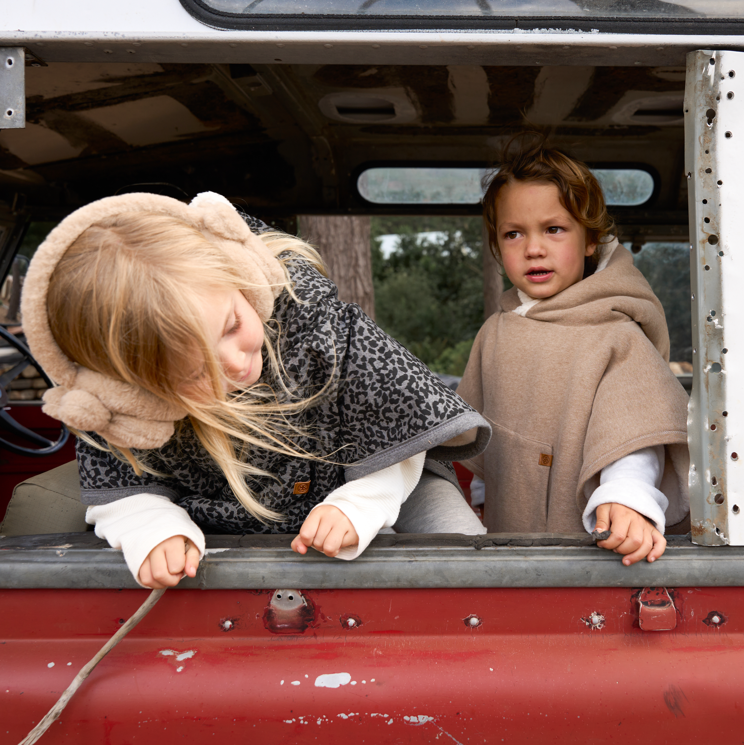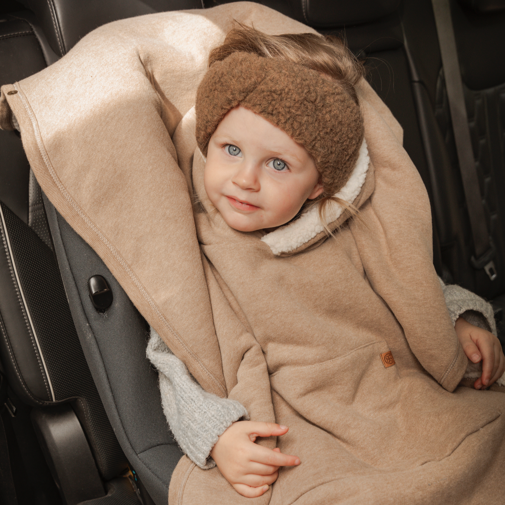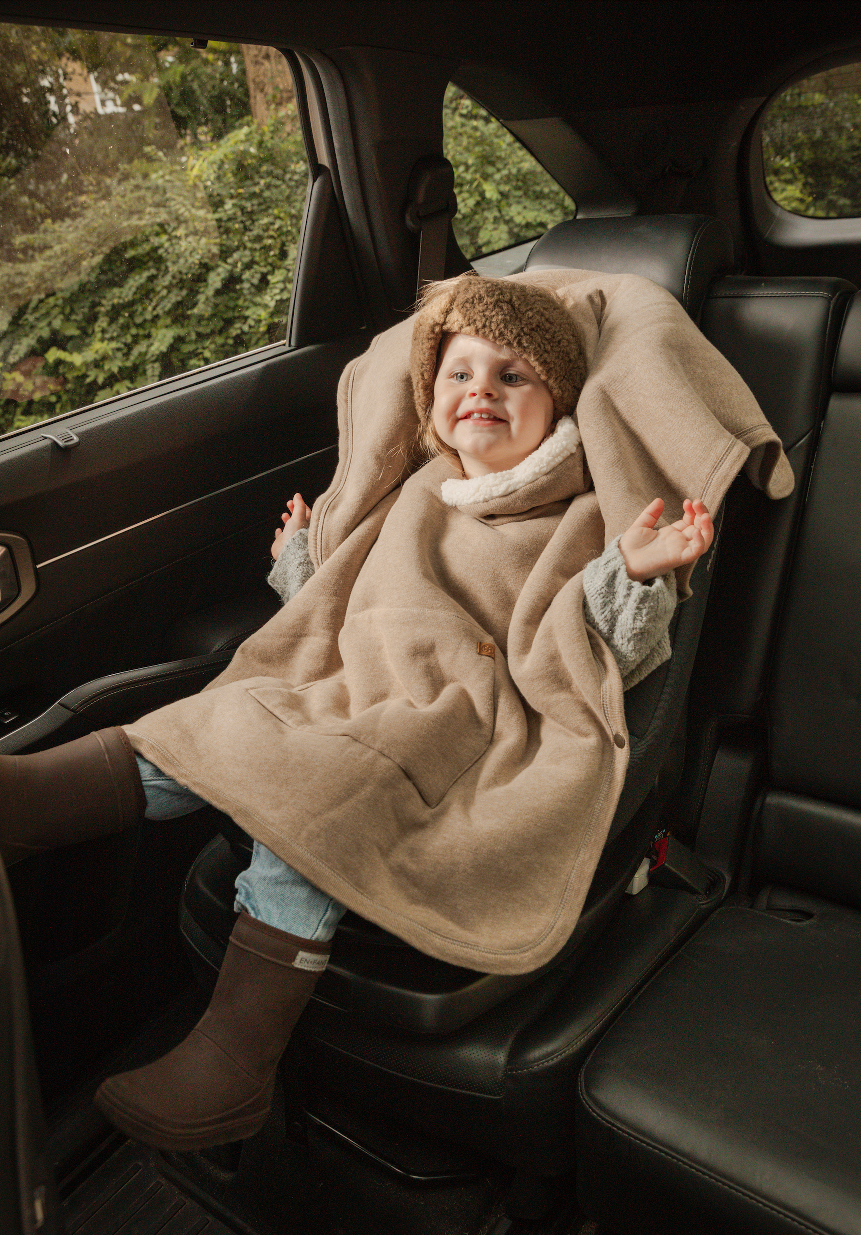 Mit einem Knopf unter den Armen, der einen Ärmel bildet, lässt sich der Poncho ganz einfach an- und ausziehen. Der Poncho ist auch ein idealer Reisebegleiter. Es eignet sich perfekt für die Verwendung in einem Autositz, wo dicke Jacken im Allgemeinen nicht unter Sicherheitsgurten getragen werden sollten. Der Poncho lässt sich bequem über den Trägern tragen. Es hat keinen Einfluss auf die Leistung des Autositzes und sorgt dafür, dass dein Kind bequem und sicher unterwegs ist.