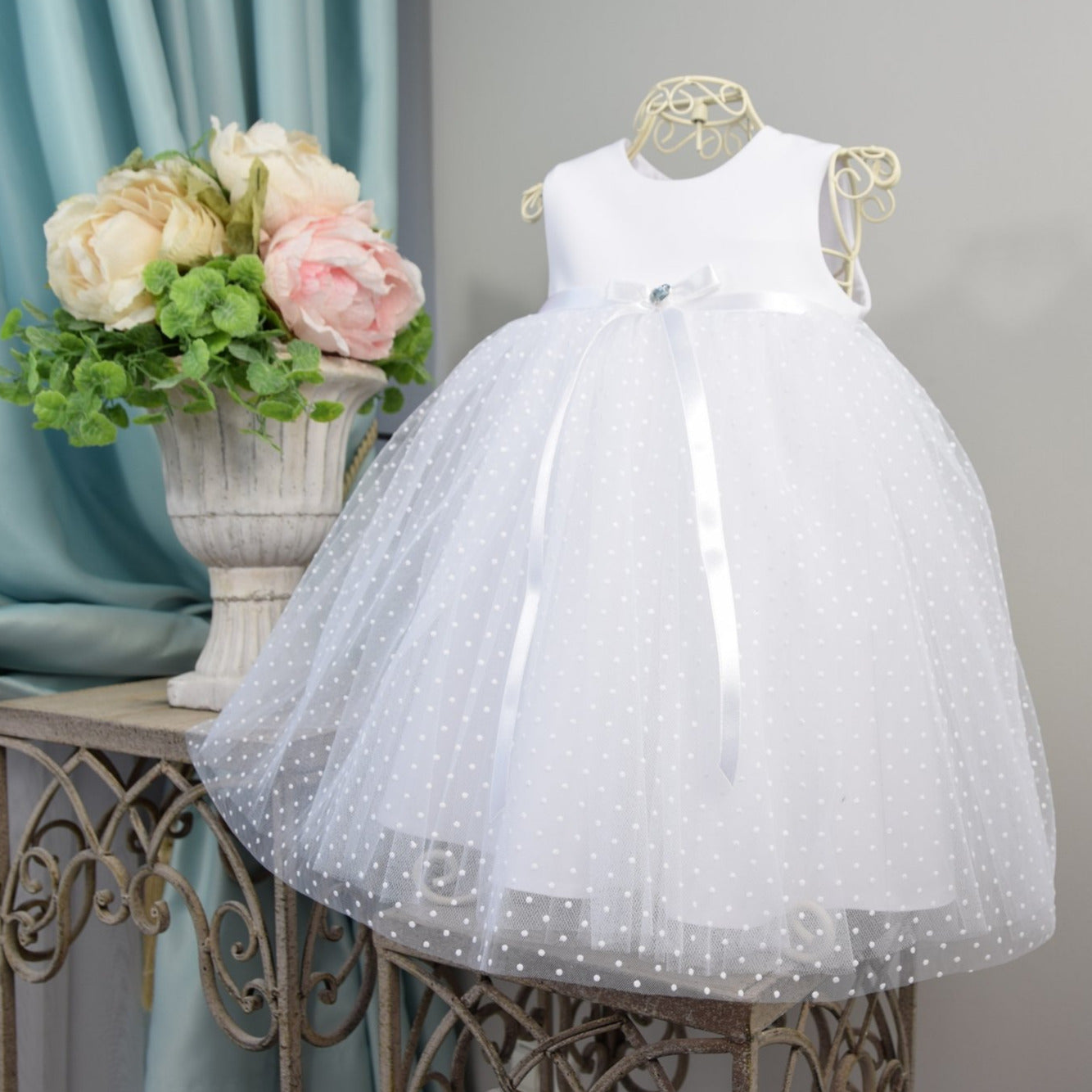 Dieses exklusive Kleid Sonja aus angenehmem Satin und Tüll besticht durch das elegante Satin Oberteil und dem wunderschönen mit Herzchen besticktem Tüllrock.